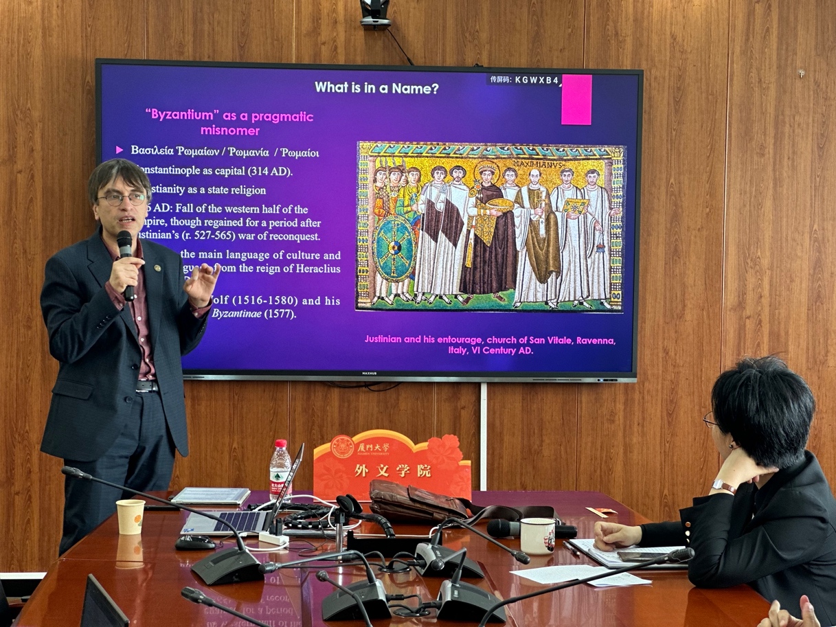 讲座特邀马其顿科学与艺术学院汉学知识中心冯海城(Igor Radev)教授主讲,他深入探讨了唐代中国与拜占庭帝国之间的交流与互动。冯教授首先从“Byzantium”这一实用别名讲起,介绍了拜占庭帝国的历史背景,包括君士坦丁堡作为首都的重要性、基督教作为国教的地位以及希腊语作为主要文化和官方语言的确立。在探讨唐代与拜占庭的关系时,冯教授引用了《后汉书》和《隋书》等古代文献,分析了古代中国文献中对“大秦”和“拂菻”(即拜占庭)的记载,同时探讨了唐代文献中提到的拂菻国使节团与拜占庭帝国之间的联系,以及这些使节团可能的宗教身份和目的。
