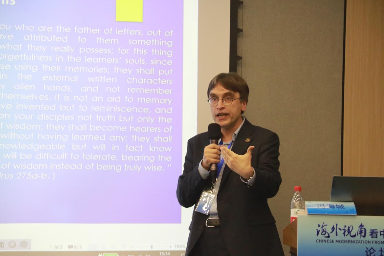 德国哥廷根大学荣休教授、德国沃尔芬比特尔奥古斯特公爵图书馆原馆长施寒微(Helwig Schmidt-Glintzer)教授聚焦“中西文明交流中的求同存异”进行了重点分享。施寒微教授指出:没有任何一种现代化模式能适用于所有国家,中国式现代化之所以成功,是因为这是一条植根于历史深处、符合中国国情的发展道路。
