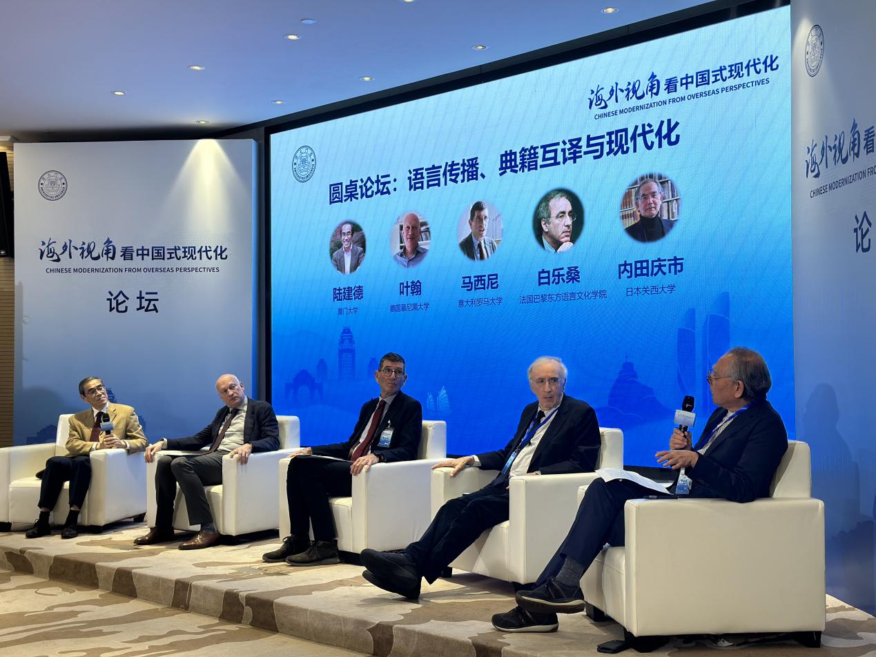 随后,“语言传播、典籍互译与现代化”圆桌论坛由厦门大学比较文学与跨文化研究中心主任陆建德教授主持。叶翰教授、马西尼教授、日本关西大学内田庆市(Uchida Keiichi) 教授、法国巴黎东方语言文化学院白乐桑(Joël Bellassen)教授共同就中西典籍互译、语言传播与现代化之间关系等重要话题进行了充满真知灼见的深入探讨。