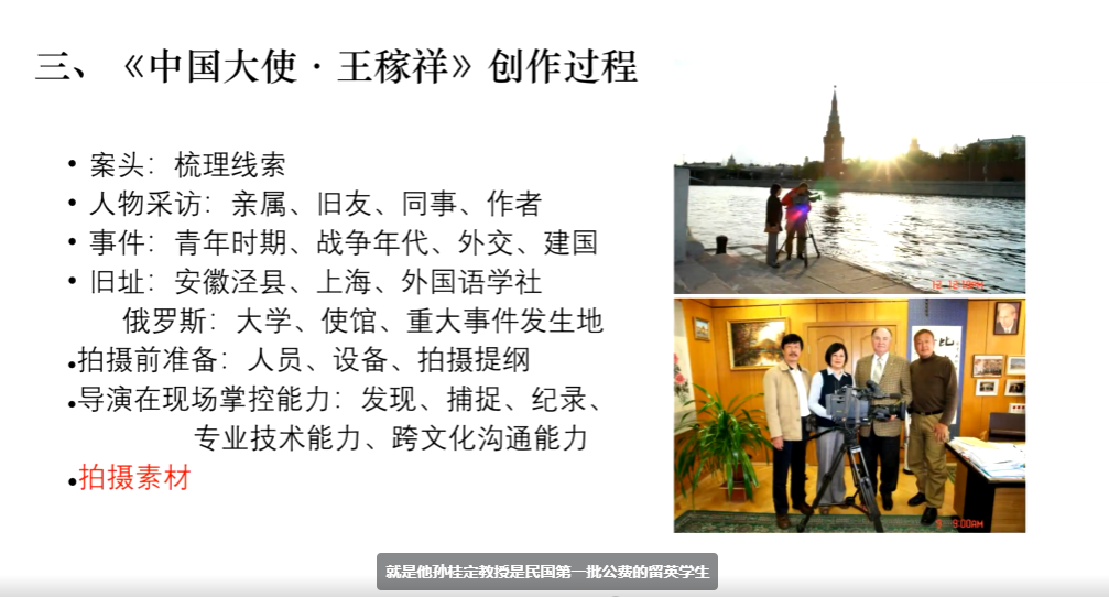 随后,王伟平导演通过讲述自己在俄罗斯国家档案馆拍摄素材的经历,向与会师生分享创作技巧。她指出,在拍摄过程中,创作者应学会从大量素材与信息中抓住人物身上的亮点和叙事碎片,挑选吸引人的故事元素进行编排;素材拍摄后要进行归类,以便查找与剪辑。在剪辑过程中,创作者构建叙事时要注重情节化,寻找兴奋点与矛盾点,让故事有发展的过程,并用遗址、文献、照片等史料丰满故事。同时,王老师强调,重中之重是要抓住细节,因为细节是最有趣的故事,也是故事化最重要的部分。