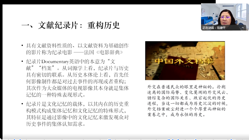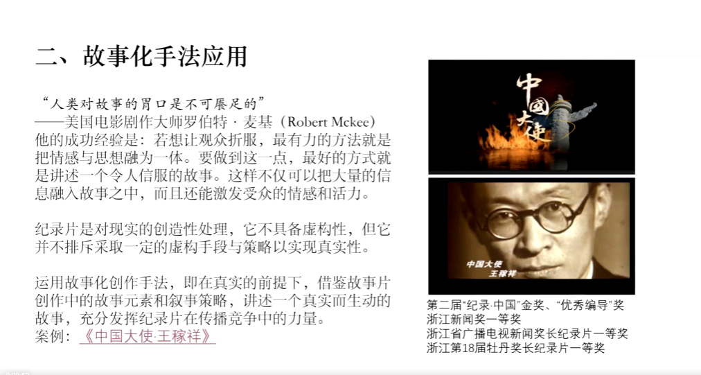讲座之初,王伟平导演指出,外交题材纪录片由于无法实时拍摄,只能依靠记忆与阅读,创作难度往往较大。而运用故事化的手法向观众讲述令人信服的故事,则可以解决这一问题,达到传播目的。王老师以纪录片《中国大使•王稼祥》为例,深入浅出地探讨了如何把握故事化创作中的真实性和虚构手段。她强调,虽然纪录片是对现实的创造性处理,但创造者绝不能虚构情节,而应在真实的前提下,通过故事化的创作手法和策略来实现真实性。