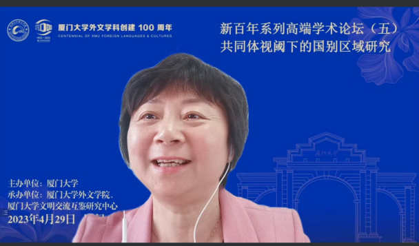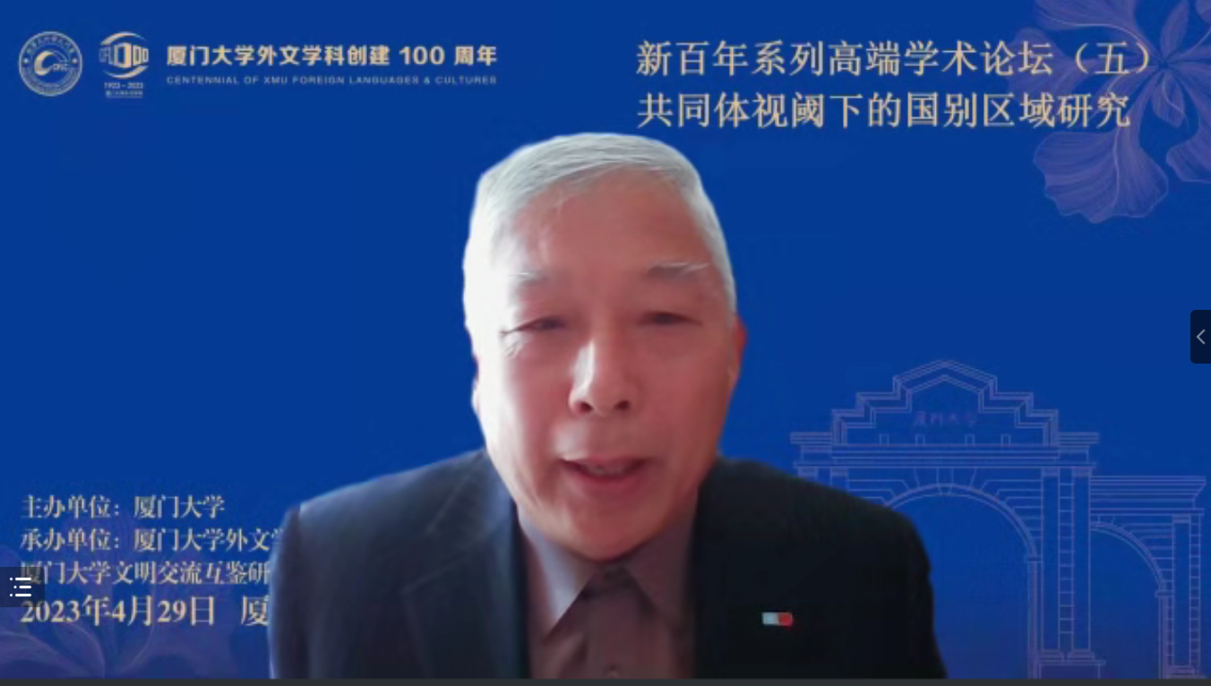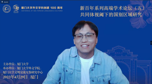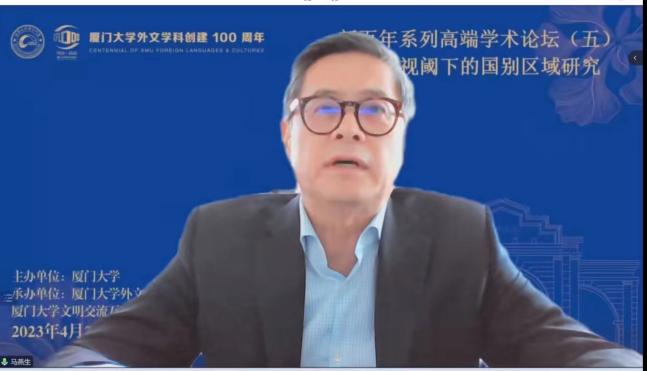 2023年4月29日,厦门大学外文学科新百年系列高端学术论坛之“共同体视域下的国别区域研究”论坛成功举办。本论坛由厦门大学主办、厦门大学外文学院和厦门大学文明交流互鉴研究中心共同承办,于腾讯会议、Zoom会议以及外文学院会议室线下会场同时进行,是为庆祝厦门大学外文学科创建百年而举办的一场高规格学术交流活动。本次论坛以构建人类命运共同体理念为出发点,致力于探讨国别区域研究及文明交流互鉴重要议题,立足但不限于外语学科视角,推动学科交叉创新。论坛设立主旨报告环节以及“海外中国研究——驱动与发展”“全球视野,家国情怀——外交官视野下的国别区域人才培养”“跨越边界与全球中国”三个分论坛,邀请国内外知名专家学者相聚云端,深入探讨交流,为促进形成学术研究共同体、人文交流共同体以及行动共同体作出贡献。