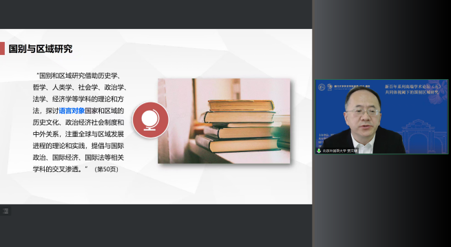 首先是“为什么?”,我想作为外国语言文学学科,在2013年,国务院学位委员会就非常清晰的列出了我们的五个领域——外国语言研究、文学研究、翻译研究,第四个领域也是二级学科方向,就是国别与区域研究,然后第五个方向是比较文学与跨文化研究,所以在讨论区域国别学作为一级学科的时候,有外语学科的同仁就曾认为、也许现在还这么认为,说我们已经有了国别区域研究,为什么还要出现一个一级学科和我们外国语言文学学科比肩并立,等于说放到了一个词,对的。这是当时我们在2013年定义国别与区域研究的时候,是外国语言文学科对这个的定义是这样的。国别和区域研究借助历史学、哲学、人类学、社会学、政治学、法学、经济学等学科的理论和方法,探讨语言对象国家和区域的历史文化、政治经济社会制度和中外关系,注重全球与区域发展进程的理论和实践,提倡与国际政治、国际经济、国际法等相关学科的交叉渗透。我在这儿强调“语言对象”这四个字,想突出的一点就是外语学科在定位国别区域研究的时候,是和语言紧紧联系在一起的。表达的方式是语言对象国家和区域。所以这和区域国别学在其他学科门类下的研究——历史学、经济学、政治学等等,这是外国语言文学学科的一个学科自我认识和定位的一个集中表现。就是说,外国语言文学学科的区域国别研究,应该不同于或有别于、或者说和其他学科门类的区域国别研究相比有特色,而且它也必须这样做,因为它不可能什么都做。在2012年的时候,就是我本人所在的二级学科德语语言文学,在本科人才培养方面,是在教育部高教司正式出版了本科专业目录和专业介绍里面提出了这样的培养要求,是主要学习德语国家语言文学,这是本行和基础,这是必须不能够舍弃的。然后在此基础上是历史、政治、经济、外交、社会、文化等方面的基本知识。这是二级学科,我是从德语专业的角度来继续谈这个问题。在2012年出版的这一个本科专业目录和专业介绍里面,要求德语专业学生取得获得的能力还包括能用德语就本国国情与文化较好地进行表达和交流,就是用德语讲中国故事。当时是明确地提出了这样一些要求。在2020年的时候,国家的新的本科教学质量标准的一个出台,各个语种专业制定了教学指南,《德语专业指南》提出了语言学、文学、国别和区域研究、翻译学、跨文化研究五个专业方向及建议课程,把国别和区域研究明确地进行了表述。这是《指南》对德语在这些基础上形成跨学科知识结构,体现专业特色。而且和其他的几个专业的《指南》比,德语专业还有这么一个表述:要求学生有国情研判能力,这所有的《指南》里面就只有德语专业有这样一个概念,在当时也引起了大家的讨论和争议。因为大家认为本科学生很难具备国情研判能力。当时我们争议的是说博士生能否具备真正的、我们希望达到的国情研判能力,也是要讨论的。所以我们写在这儿是一种导向、是对学生的一个引导和激励。所以这样一路走来,从外国语言文学学科作为一级学科,从我本人所在的德语语言文学学科,其实多年以来的一种探索、一种推动,所以集中体现在了这样一个国家的、十年一次的对学科专业目录的一个修订,这样区域国别学可授予的学位之一是包括文学学位。