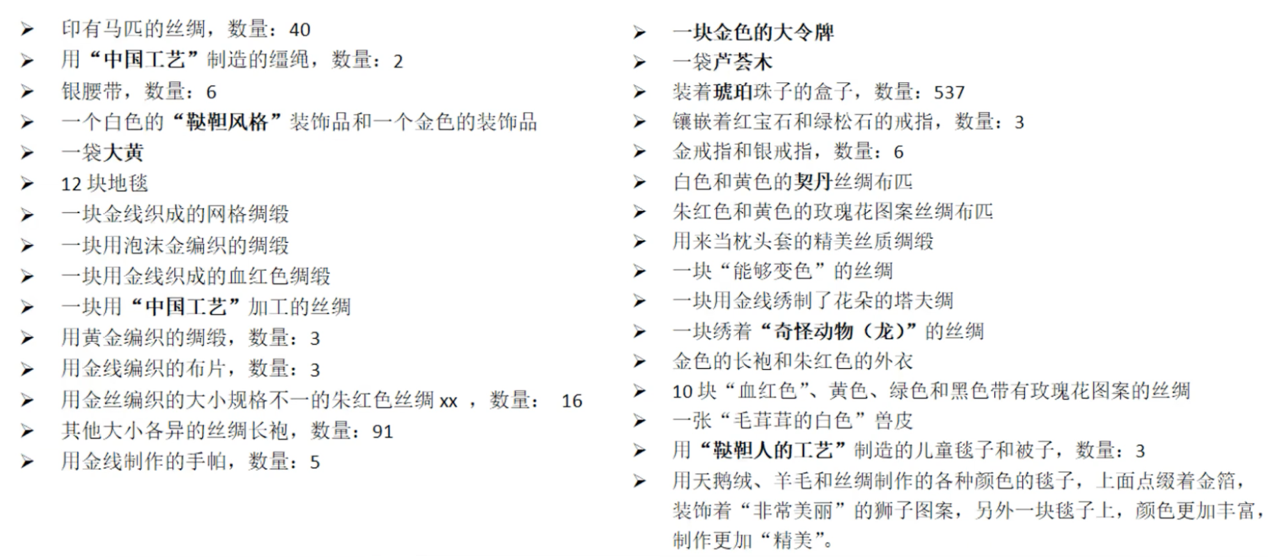 从清单上可以看出,马可·波罗从中国带回来不少物品,如两件带有“中国工艺”的产品、来自中国的血红色丝绸,以及在中国作为权力象征而赠送给随从的令牌;还有绣着“奇怪动物(龙)”的丝绸帷幔。此外,清单中还出现了一些要作为嫁妆赠送给女儿的日用品,也是这类文书中经常会出现的一些物品,如床、大型精美的床单、桌布、