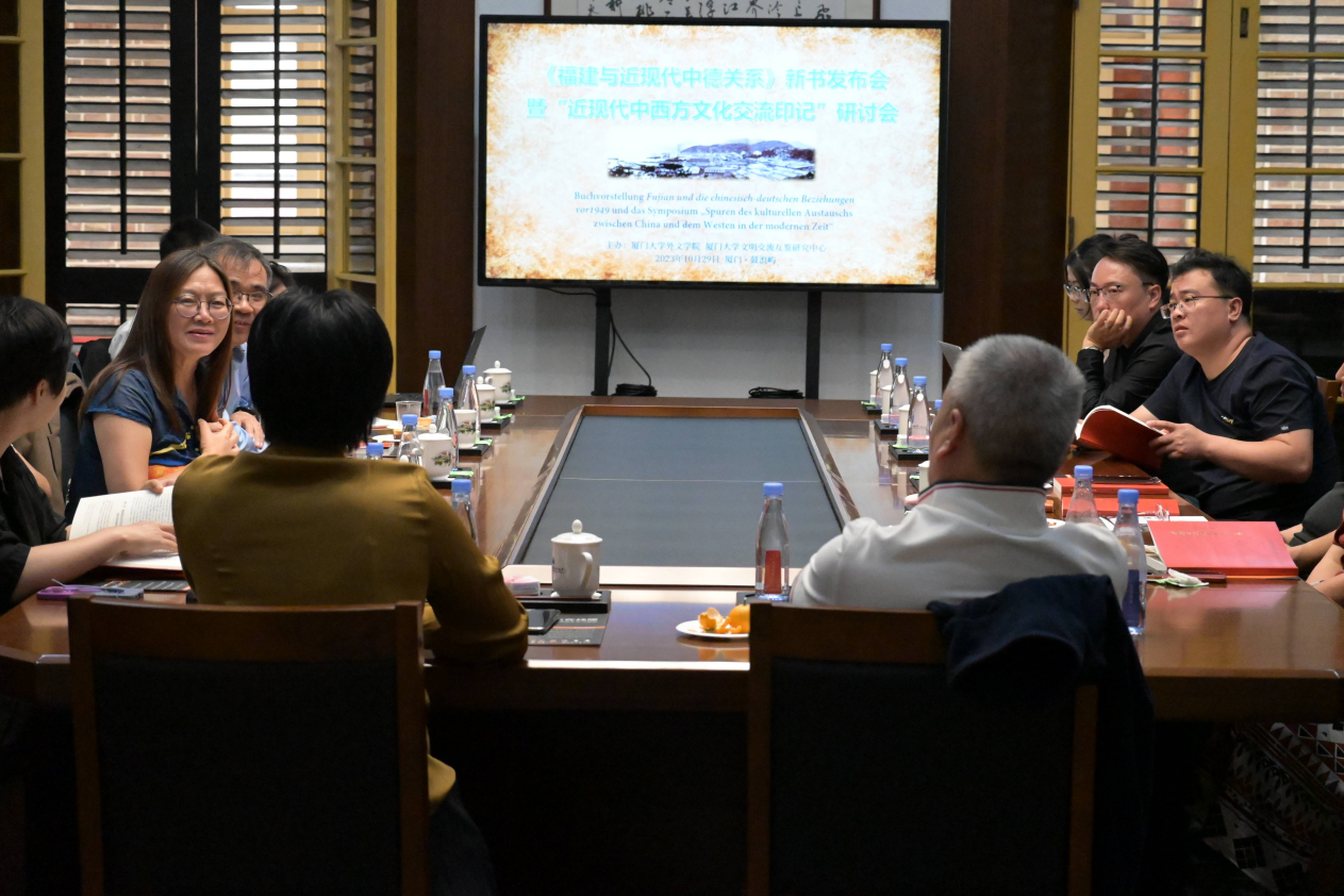 2023年10月29日下午,由厦门大学外文学院、厦门大学文明交流互鉴研究中心主办的《福建与近现代中德关系》新书发布会暨“近现代中西方文化交流印记”研讨会在厦门大学人文与艺术高等研究院(原日本驻鼓浪屿领事馆旧址)举办。本次活动由厦门大学文明交流互鉴研究中心执行主任、《福建与近现代中德关系》一书主编刘悦教授发起,厦门大学讲座教授范捷平主持,大连外国语大学副校长丛明才教授、南京大学孔德明教授、对外经济贸易大学潘亚玲教授、北京航空航天大学吴晓樵教授、青岛大学綦甲福教授、郑州大学张晓青教授、德国学术交流中心北京办事处副主任刘潇潇等十多位中德交流研究界专家学者出席了本次活动。